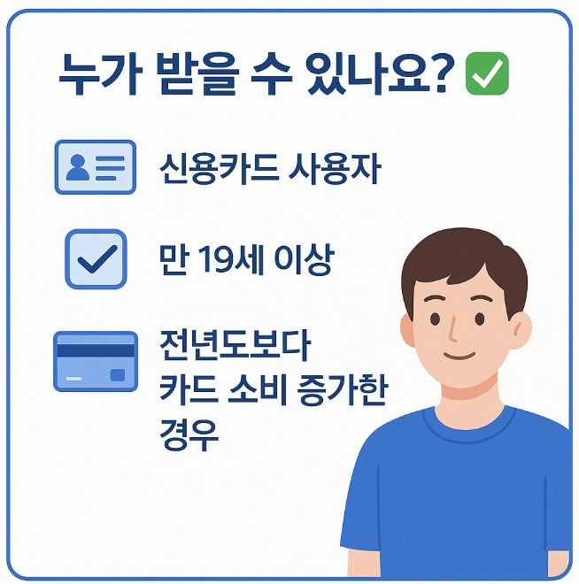 상생페이백 신청을 위해서는 일정 조건을 충족해야 합니다. 만 19세 이상 국민 또는 국내 거주 외국인으로, 2024년에 본인 명의 신용·체크카드 사용 실적이 있어야 하며, 2025년 9~11월 기간 동안 카드 사용액이 2024년 본인 카드 월평균 소비액보다 증가해야 환급 대상이 됩니다.