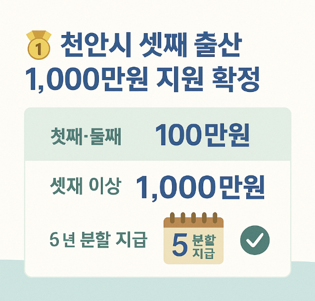 📌 핵심 체크: **천안 셋째 출산 1000만원** 지원은 5년간 분할 지급되며, 지급 기간 동안 천안시를 벗어나면 지급이 중단될 수 있으니 거주 요건을 반드시 확인하셔야 합니다.